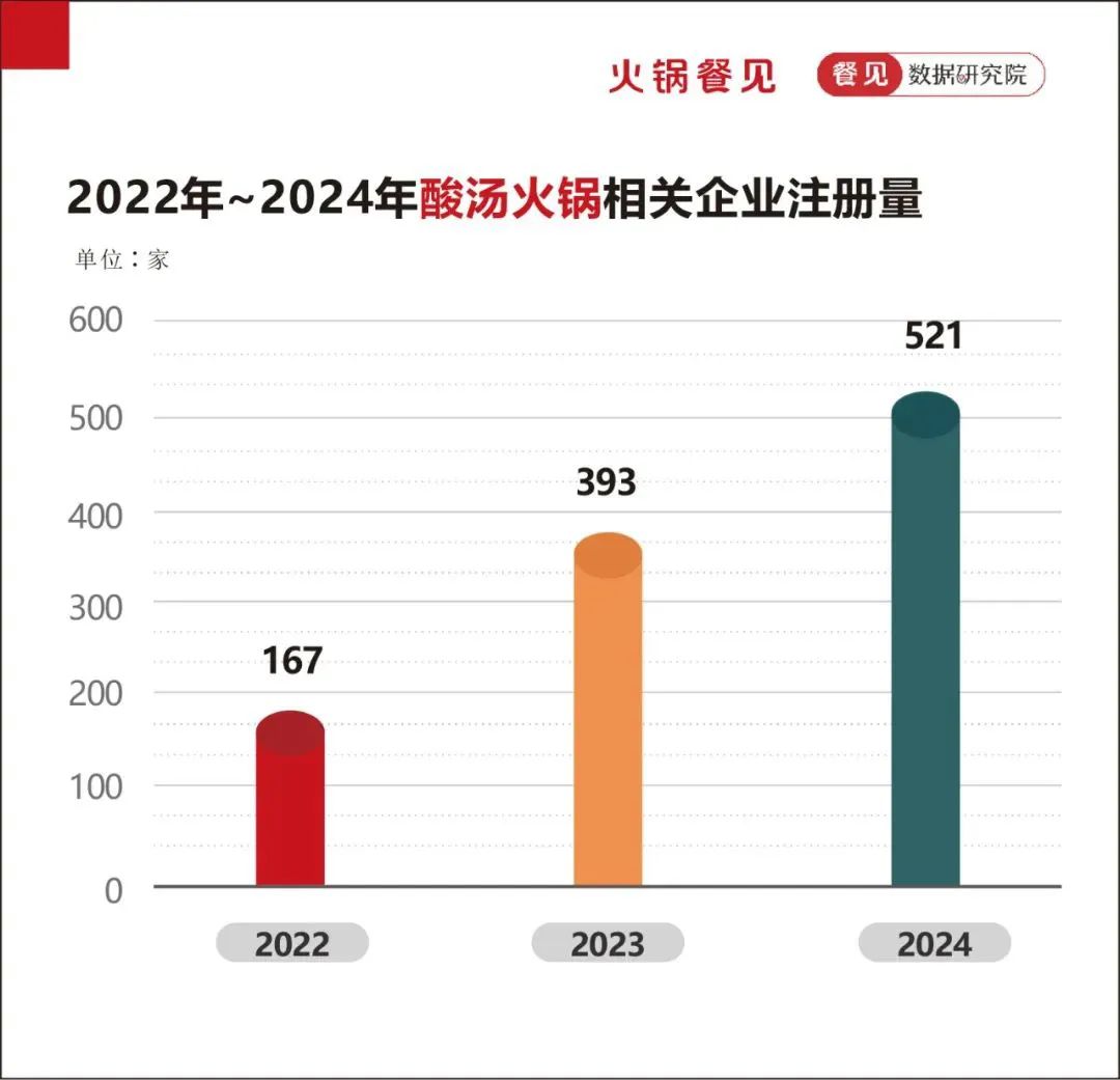 根據企查查數據顯示,2022年~2024年酸湯火鍋相關企業註冊量以此是167家、393家、521家,呈現依次上漲趨勢。