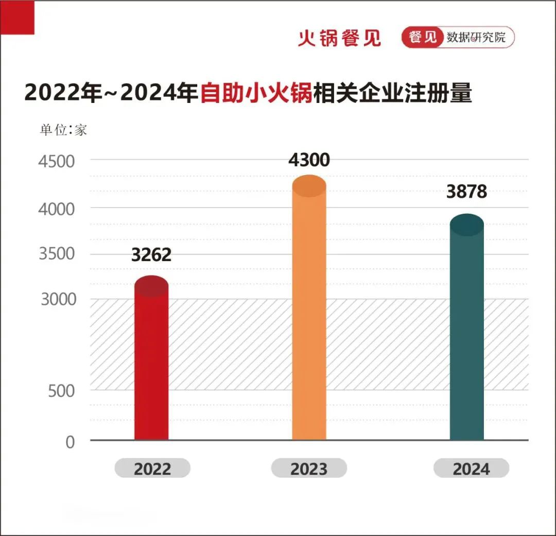 根據企查查數據顯示,2022年~2024年自助小火鍋相關企業註冊量依次為3262家、4300家、3878家。