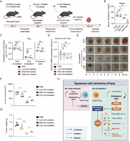 根據國際癌症研究機構(IARC)發佈的最新全球癌症數據,2021年乳腺癌新發病例達到226萬,超過肺癌的220萬,成為全球最大的癌症。然而,在40歲以上的男性和60歲以上的女性中,肺癌造成的死亡人數遠遠超過乳腺癌、前列腺癌、結直腸癌和白血病的總和,使其成為威脅老年人健康的主要癌症。老年人肺鱗狀細胞癌(LSCC)的發病率較高,並隨着年齡的增長而逐漸增加。近一半的患者在確診時年齡超過70歲。此外,老年LSCC患者的中位生存期比其他非小細胞肺癌(NSCLC)亞型患者短約30%。因此,探索影響老年LSCC進展的分子機制並尋找改善老年患者預後的特定治療靶點具有重要意義。免疫系統識別並消除體內衰老和癌細胞,在免疫監視和維持身體內部環境的穩定性中發揮重要作用。眾所周知,免疫系統功能下降是生物體衰老的主要特徵之一,這導致了許多與衰老相關的疾病的發生。此外,衰老和腫瘤發生的機制也有一定的相似性。越來越多的證據表明,由類似機制驅動的基因組和表觀基因組改變在衰老細胞和癌細胞中均可發現。此外,在DNA損傷劑誘導的衰老細胞和癌細胞中,細胞核cGAS可以介導L1逆轉錄轉座的抑制。因此,闡明腫瘤發病機制與衰老之間的因果關係對於制定有效的老年腫瘤治療策略至關重要。越來越多的證據表明,調節性T(Treg)細胞的免疫功能增強被認為是老年癌症人羣預後不良的罪魁禍首。Treg細胞依靠脂肪酸氧化和氧化磷酸化生存,並通過糖酵解促進增殖、分化和抑制功能。此外,細胞內糖脂代謝物通過調節FOXP3的表達影響Treg細胞的轉錄程序和功能可塑性。此外,mTORC1促進體內Treg細胞的代謝重編程,導致依賴於甲羥戊酸通路的脂肪生成和膽固醇生物合成增加,以支持Treg細胞增殖和功能。糖脂代謝紊亂的老年人比例遠高於年輕人。探究糖脂代謝異常後Treg細胞的功能變化,或為老年癌症患者的治療提供新的線索。