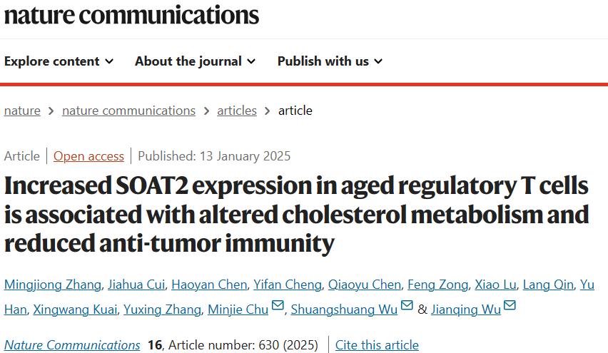 2025年1月13日,南京醫科大學吳劍卿、吳雙雙及南通大學褚敏捷共同通訊在Nature Communications 上在線發表題為“Increased SOAT2 expression in aged regulatory T cells is associated with altered cholesterol metabolism and reduced anti-tumor immunity”的研究論文。研究發現ER跨膜酶,固醇o -酰基轉移酶2 (SOAT2)在老年肺鱗狀細胞癌(LSCC)患者的調節性T細胞(Treg)中過表達,而LSCC患者的影像組學分析表明SOAT2表達增加與免疫浸潤減少和不良預後相關。