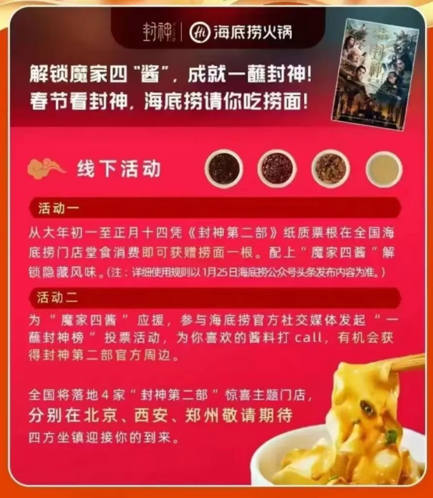 此前憑藉《前任4》《沒有一頓火鍋解決不了的事》等深度聯動,建立起市場認知的海底撈,與淘票票以《封神2》為契機,建立合作關係。海底撈將推出一“蘸”封神主題活動,觀眾可憑紙質票根在全國海底撈門店獲贈撈麪,解鎖“魔家四醬”隱藏風味,並有機會獲得官方周邊。同時,海底撈還會在北京、西安、鄭州開啓驚喜主題門店。