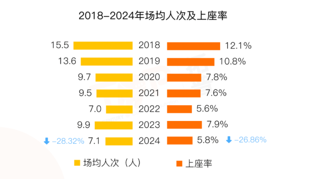 不振的票房成績背後,還有許多數據值得警醒:根據拓普數據顯示,2024年觀影人次10.09億,僅為2019年六成水平;場均人次7.1人,上座率5.8%均不及2018年的一半水平;與此同時,影院承壓明顯,2024年影院場均收益299.2元,較2019年同期回覆率僅為59.4%。