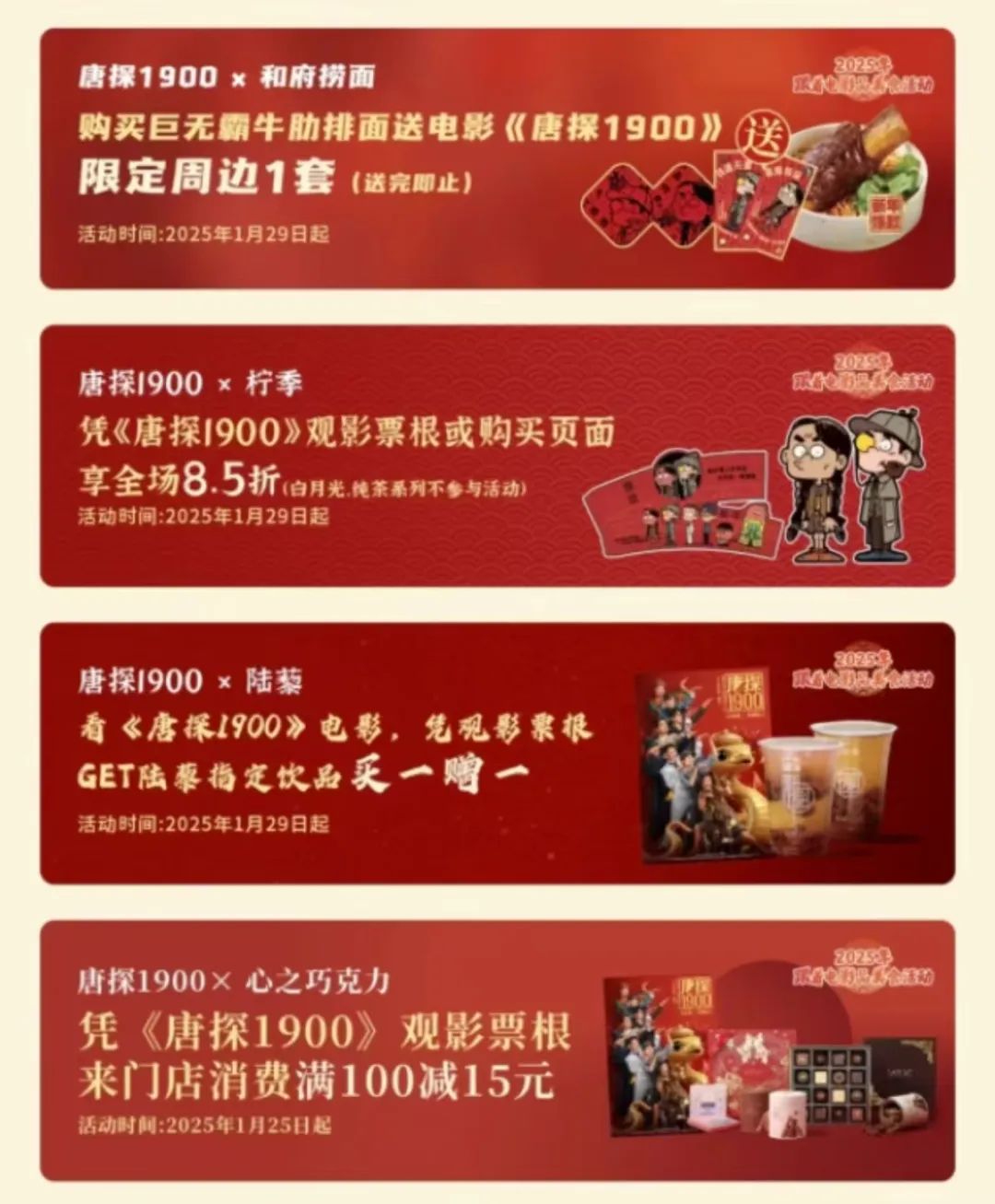 以《唐探1900》為例,平台將發起“吃遍唐人街·‘唐探宇宙’城市美食”活動,與近三十家餐飲品牌聯合營銷,觀眾可憑電影票享合作門店專屬折扣或消費可抽取電影票、領取電影周邊。
