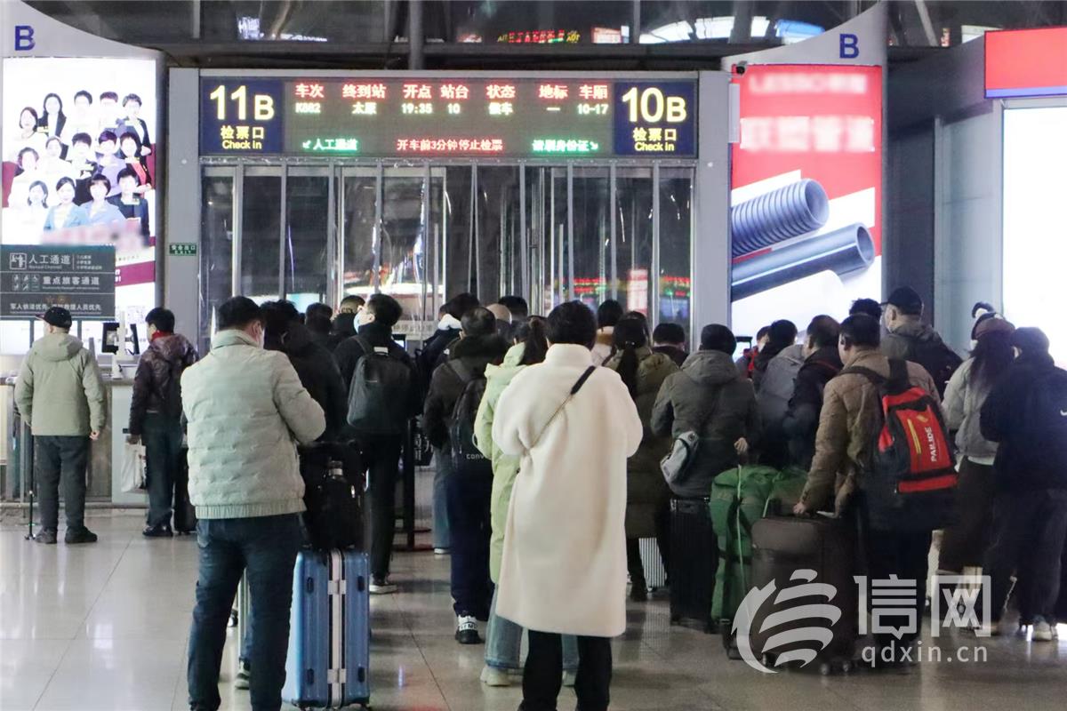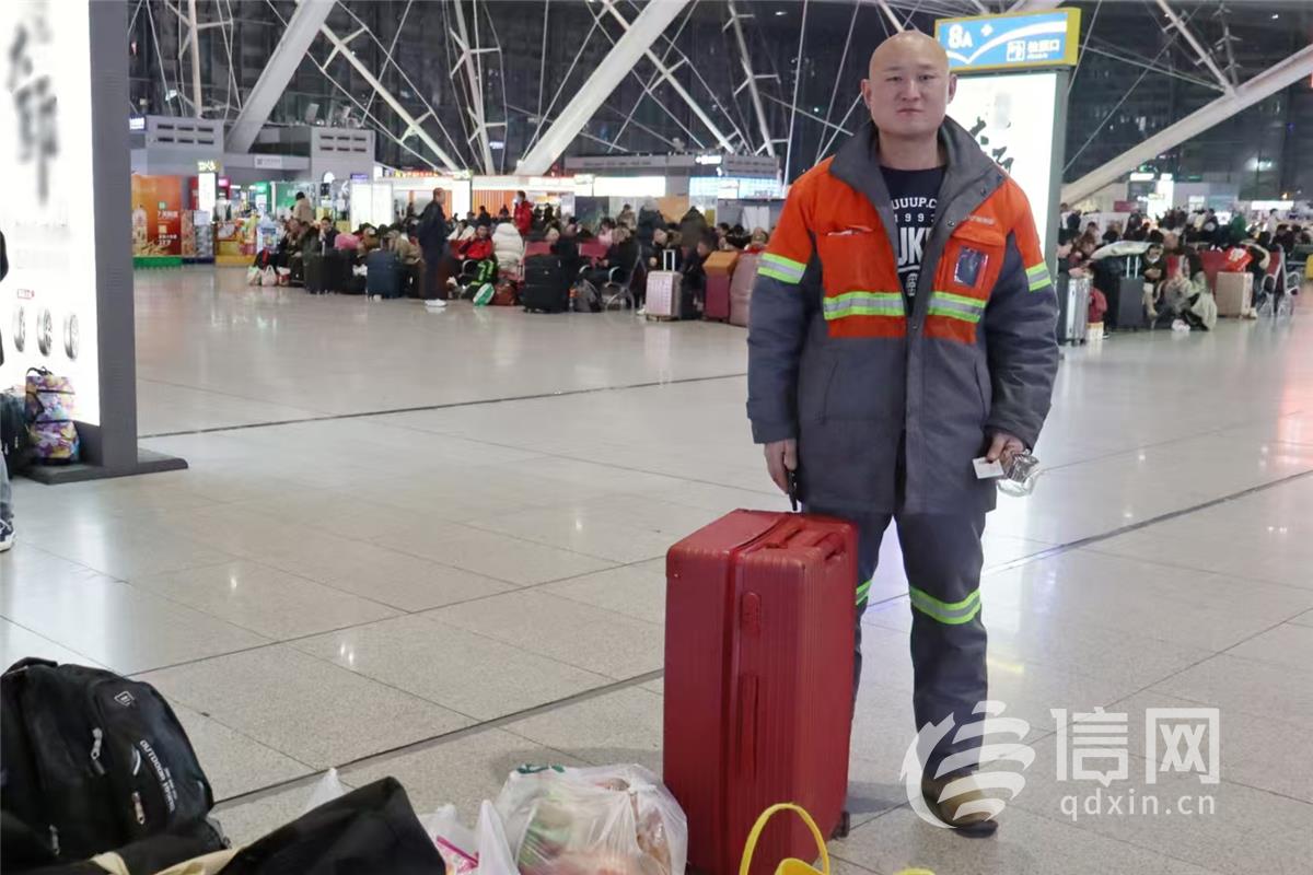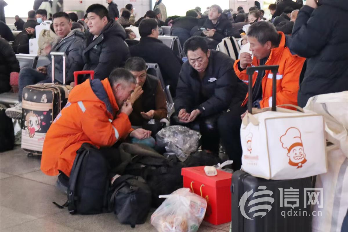 不一會兒,12A檢票口旁傳來了一陣陣爽朗的笑聲。最初,三位大叔笑着拒絕了採訪,“找個年輕人吧,我們不懂”。隨後,大叔們主動攀談起來。“我們是濟寧的,在青島打工,一年都沒回家了,想家!”大叔們説,雖然只買到硬座,要坐七八個小時,但只要想到回家過年,和家人團聚,一點也不累。從他們的臉上,可以感受到回家之路的喜悦。