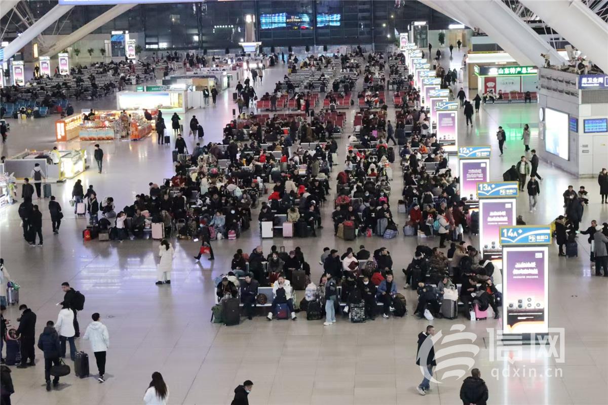 走進青島北站候車廳,部分候車區域坐滿了人羣。春節前客流高峯預計出現在1月25日(臘月二十六)、1月28日(除夕)。由於還未到春運高峯時段,整個候車廳並沒有出現擁堵情況,乘客們選擇在就近檢票口旁的長椅上,井然有序的休息、等待。