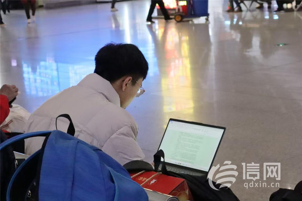 火車站內,有忙碌了一年安心等待回家的人,也有回家途中無法放下工作的當代“牛馬”。一位女士告訴信網,為了早點回家,只能申請將工作一起帶走。一年到頭只有春節能安心回到父母身邊,做一回“小孩”,帶着工作也不覺得麻煩。