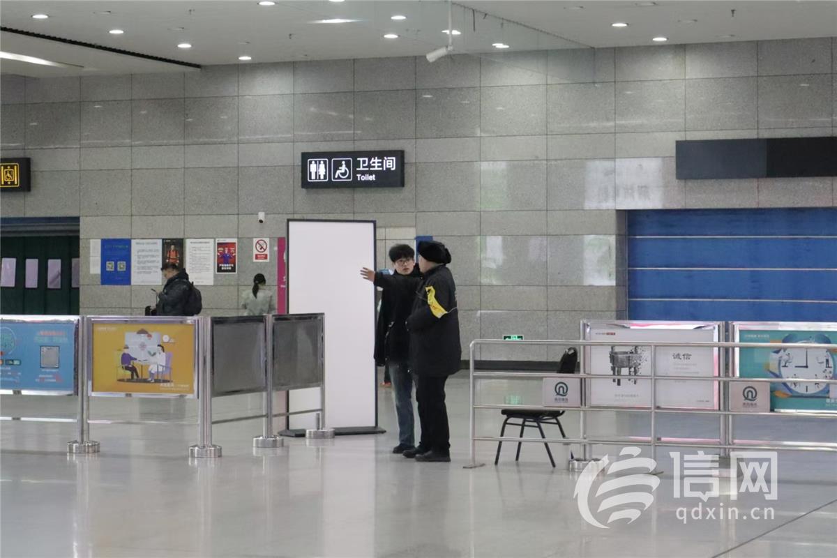 晚上八時許,青島北站,剛剛出站的人羣已有序散去。出站口有兩位身着紅色馬甲的地鐵志願服務人員,為買票、進站的乘客提供服務。