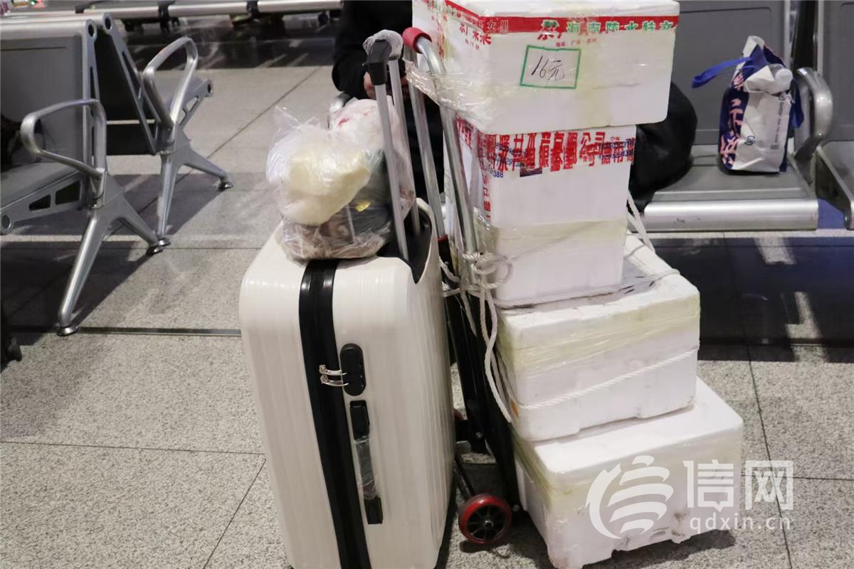 除必備的路餐外,打包海鮮成為不少人春運標配的年貨。老家是吉林省的李女士説道:“從青島回家,海鮮和啤酒是最搶手的。我一早買來新鮮的魚、蝦,還有青島啤酒。啤酒挺沉的,我們人多提着也不累,回去給家裏人嚐嚐青島新鮮的海味。”