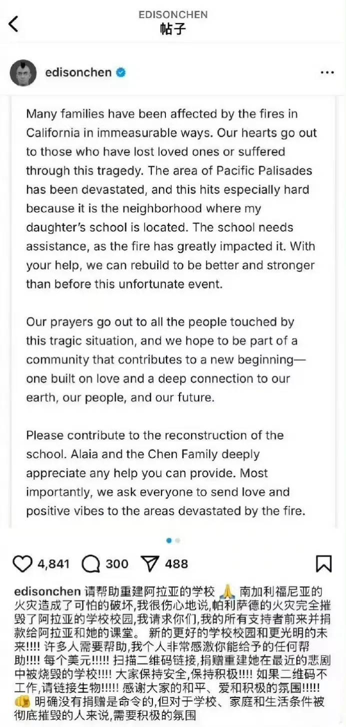 藝人陳冠希在社交平台上發文表示,其女兒Alaia的學校也在這場火災中被徹底摧毀,急需善款重建校園,並呼籲其支持者、粉絲捐款。陳冠希寫道,“我請求你們、我所有的支持者來捐款,幫助Alaia和她的同學能有嶄新的校園和更光明的未來。”