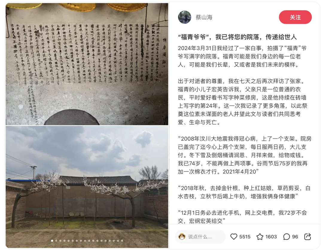 2024年3月31日,張福青葬禮那天,攝影師蔡山海在去雁門關的途中,路過上高陵村,他被葬禮的鑼鼓聲吸引,走進小院拍攝。離開時,他看到小院照壁上寫着幾行小字,“宇宙有多大呀……”