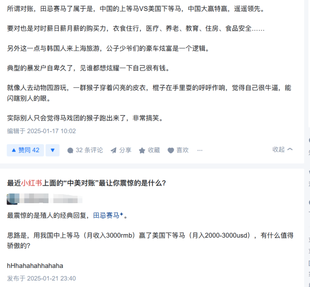 於是破防羣體徹底陷入無能狂怒,要麼找各種角度陰陽怪氣,要麼在知乎陰暗角落裏瘋狂團建,説”小紅書上的美國人説的都是假的”,或者強行“大家都一樣”,要麼就説什麼來小紅書的美國人都是底層,而小紅書用户都是中國前20%的中產,兩邊對賬屬於“田忌賽馬”。