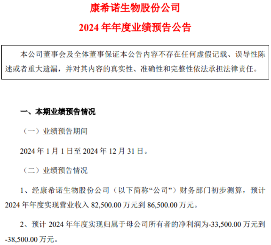 1月18日,康希諾發佈全年業績預告。2024年全年,康希諾預計實現營業收入8.25億元到8.65億元,歸屬於母公司所有者的淨利潤為-3.35億元到-3.85億元, 扣非後淨利潤為-3.95億元到-4.50億元。