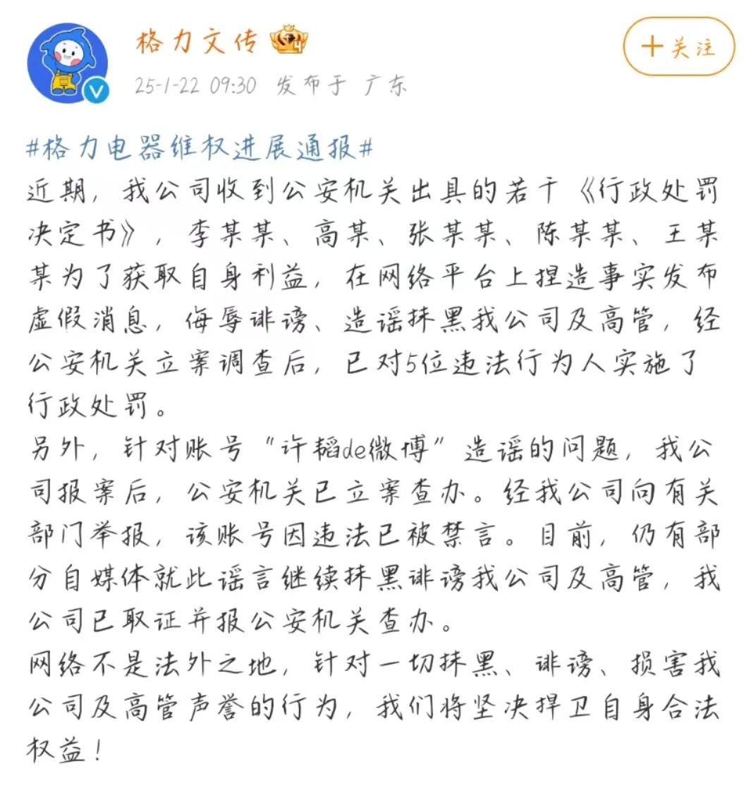 1月22日,格力披露被造謠維權進展,5位造謠者被行政處罰,造謠賬號已被禁言。不久前,董明珠被傳停職。