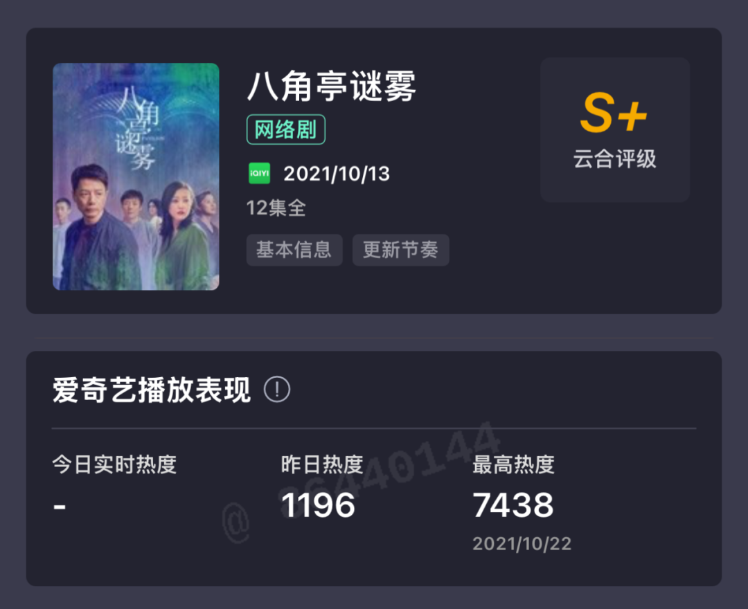 至於迷霧劇場其他幾部較為出圈的作品,《沉默的真相》最高熱度為7330(2020年9月26日),《八角亭謎霧》最高熱度則為7438(2021年10月22日)。