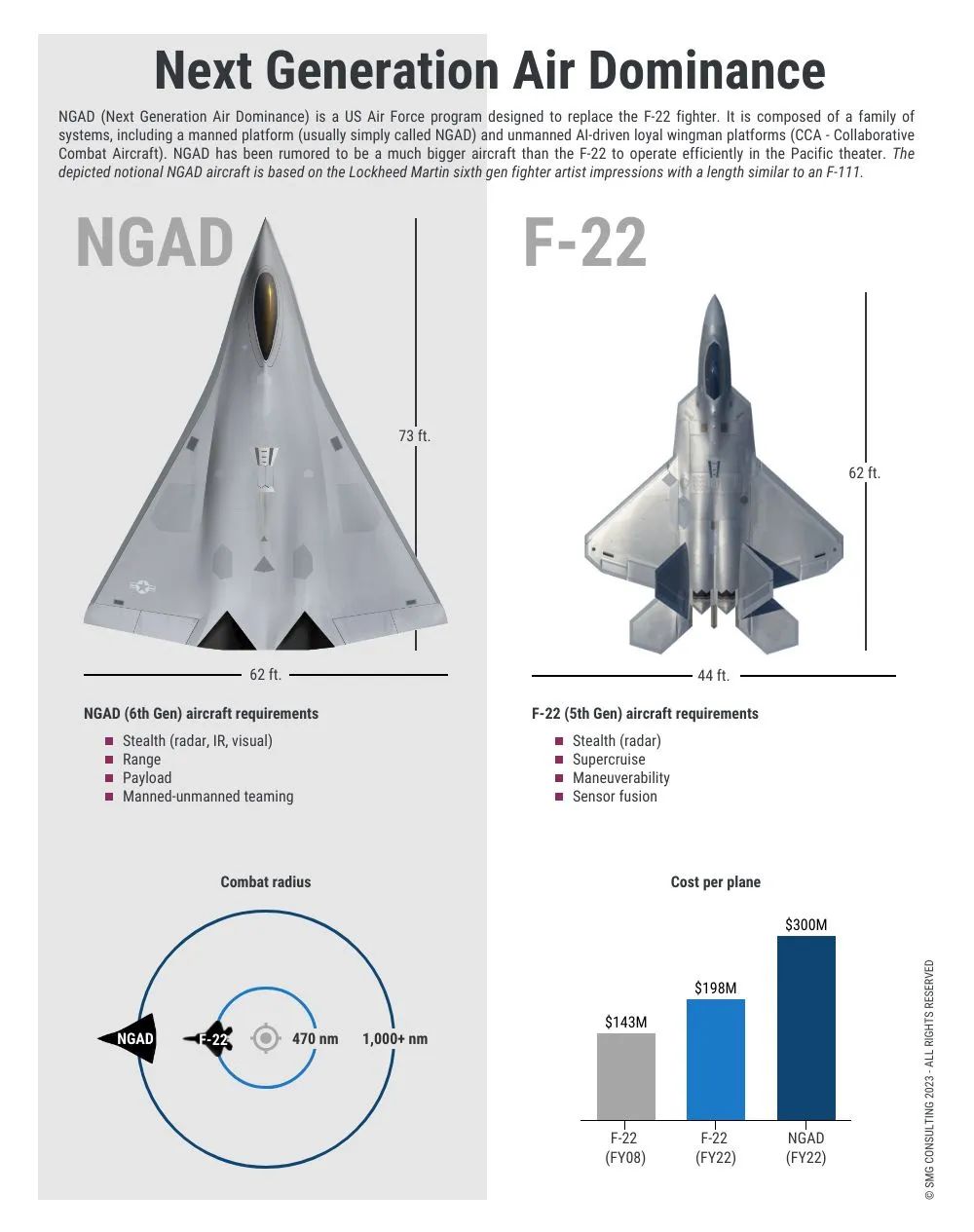 到2023年,據稱美國航空工業的御三家波音、洛馬、諾格都完成了NGAD的技術驗證機,並收到了美國空軍給的標書。在招標階段,諾格宣佈退出,作為二級承包商協助波音和洛馬。也就是説,理論上來講,2023年,NGAD項目已經走出了預研階段,已經到了正樣研製階段。