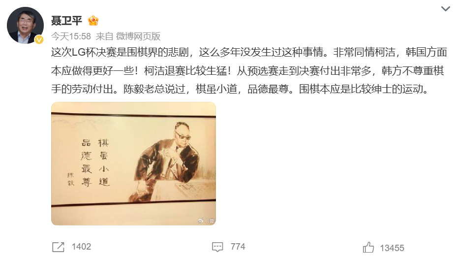 很多專業選手也站出來為柯潔發聲,其中棋聖聶衞平就表示:圍棋本應是比較紳士的運動。