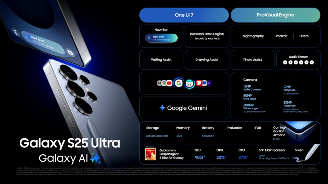但可惜的是, S25 的中杯和大杯,在硬件上面是沒啥驚喜的,全靠軟件升級了可以説是。