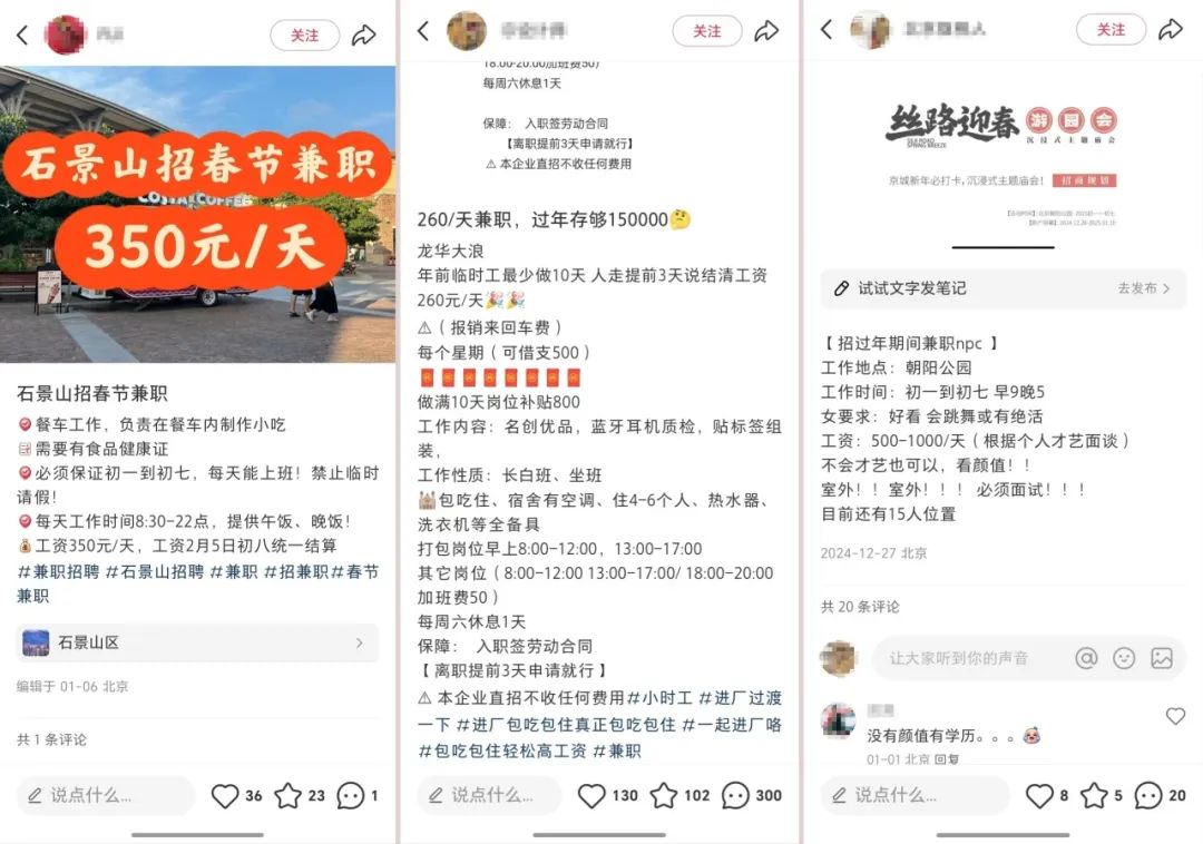 但一圈觀察下來,她發現春節零工的門檻並不低:比如餐飲行業需要辦食品健康證;一份在朝陽公園當NPC,一天賺500-1000元的工作,要求申請者會跳舞或者有絕活,通過面試才能錄取。