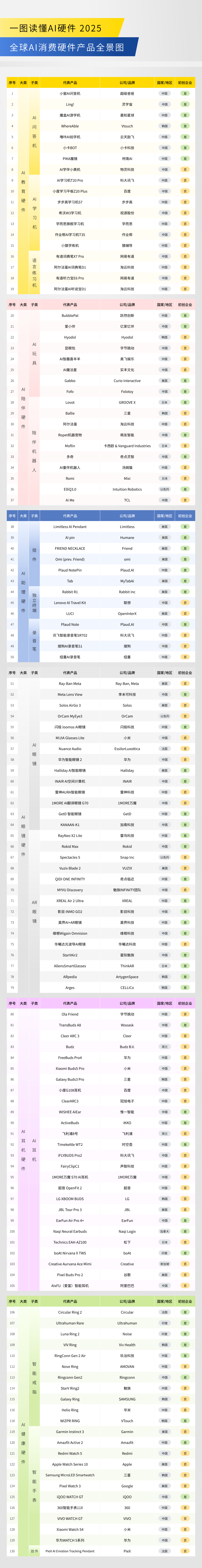 2025年初,在AI大模型和AI應用熱潮之後,消費級AI硬件也開始逐步受到市場和資本的關注,除了手機和PC外,AI也確實正在改變消費電子產品的外延和形態。截至目前,我們統計至少已有117家公司入局了AI硬件。這些硬件產品主要集中在眼鏡、耳機、教育、陪伴、助理和健康六大領域,其中有超7成為中國公司,除中國之外,美、日、韓、印、以色列企業均有參與。