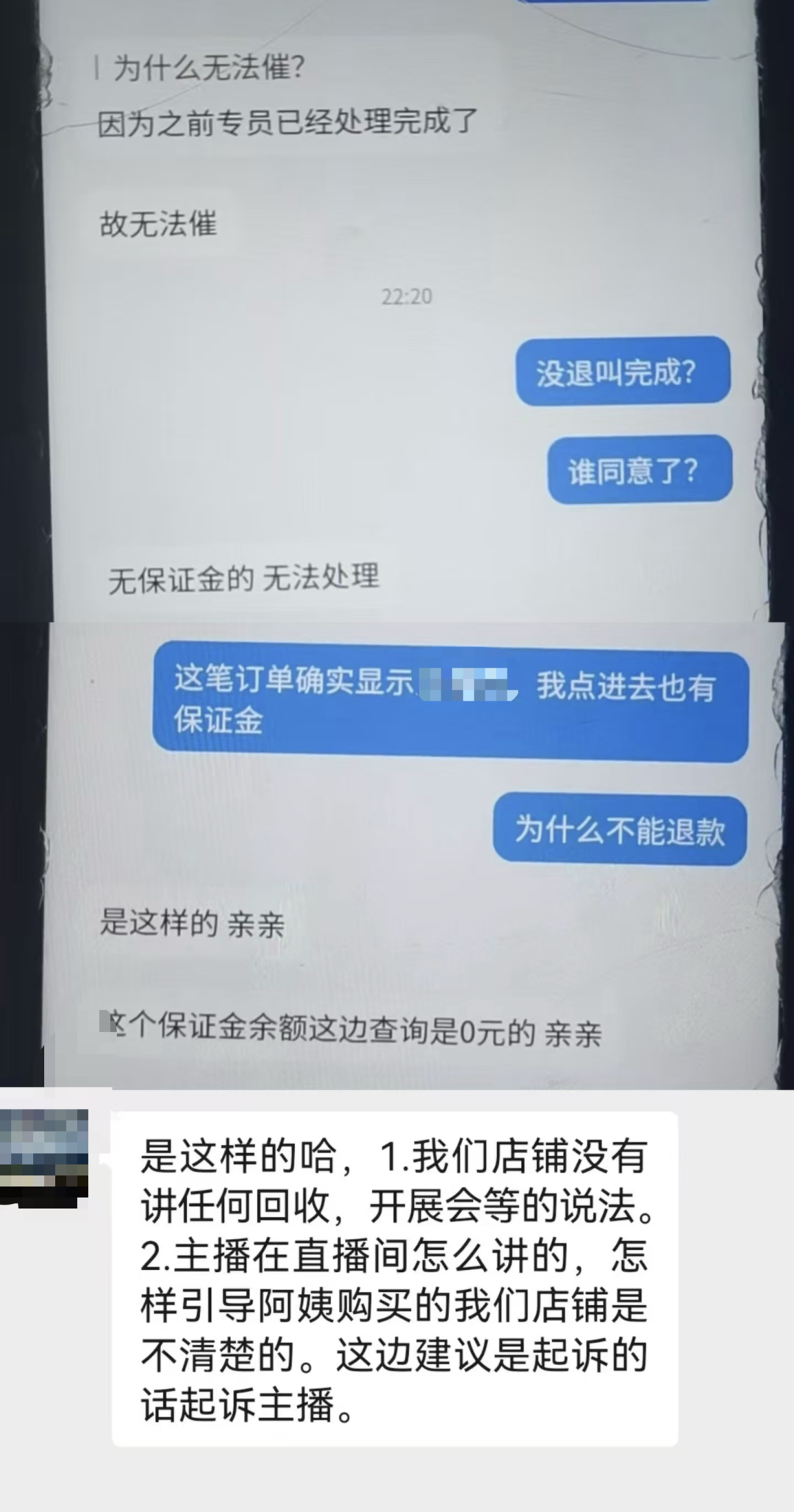 她又聯繫消協,得到的答覆是主播拿錢跑路,等主播退錢給商家,商家就會退錢。再次投訴,則只能收到消息,已經投訴過了,不要繼續投訴。