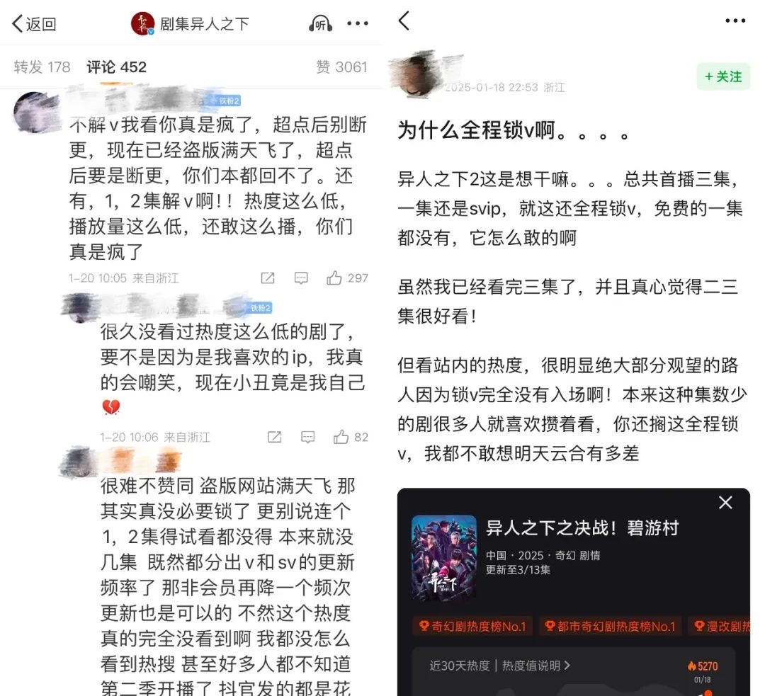 對於非粉觀眾來説,鎖V成為了入場的直接障礙,有些可能決定多觀望幾集,有些則直接網盤見。這不僅意味着正版觀眾流失,更意味着熱度上漲緩慢,令劇集精神股東、年輕主演粉絲都難掩焦慮。