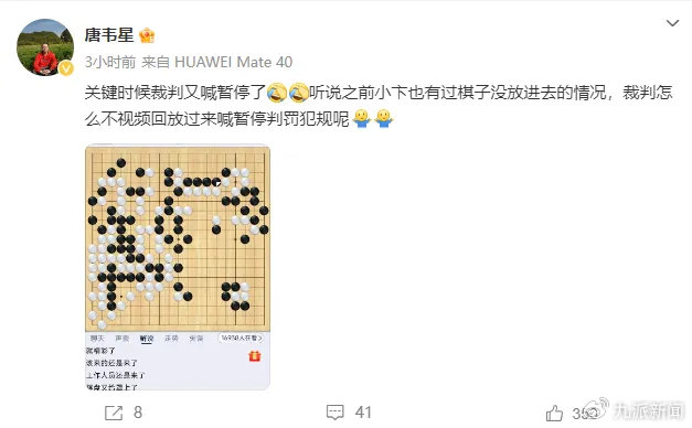 世界冠軍、圍棋國手唐韋星:“關鍵時候裁判又喊暫停了,聽説之前小卞也有過棋子沒放進去的情況,裁判怎麼不視頻回放過來喊暫停判罰犯規呢。”