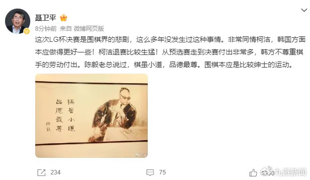 聶衞平就此事發聲,其表示:“這次LG杯決賽是圍棋界的悲劇,這麼多年沒發生過這種事情。非常同情柯潔,韓國方面本應做得更好一些!柯潔退賽比較生猛!從預選賽走到決賽付出非常多,韓方不尊重棋手的勞動付出。陳毅老總説過,棋雖小道,品德最尊。圍棋本應是比較紳士的運動。”
