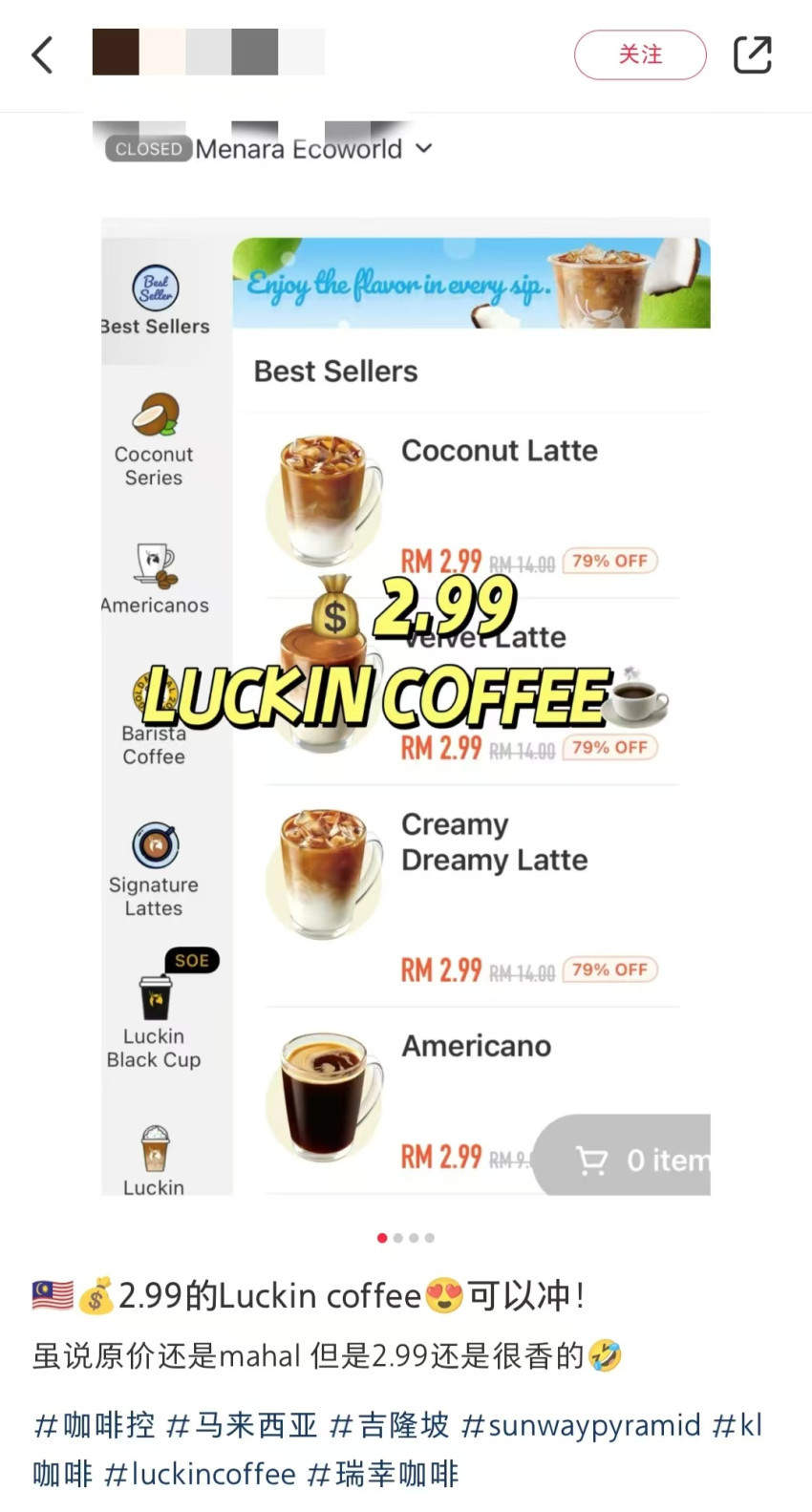 據瞭解,為了吸引當地消費者並推廣瑞幸的Luckin Coffee APP,瑞幸官方趁着門店開業,推出了特惠活動,用户首次使用APP應用下單,全場產品僅需2.99RM(馬幣),摺合人民幣約5元。