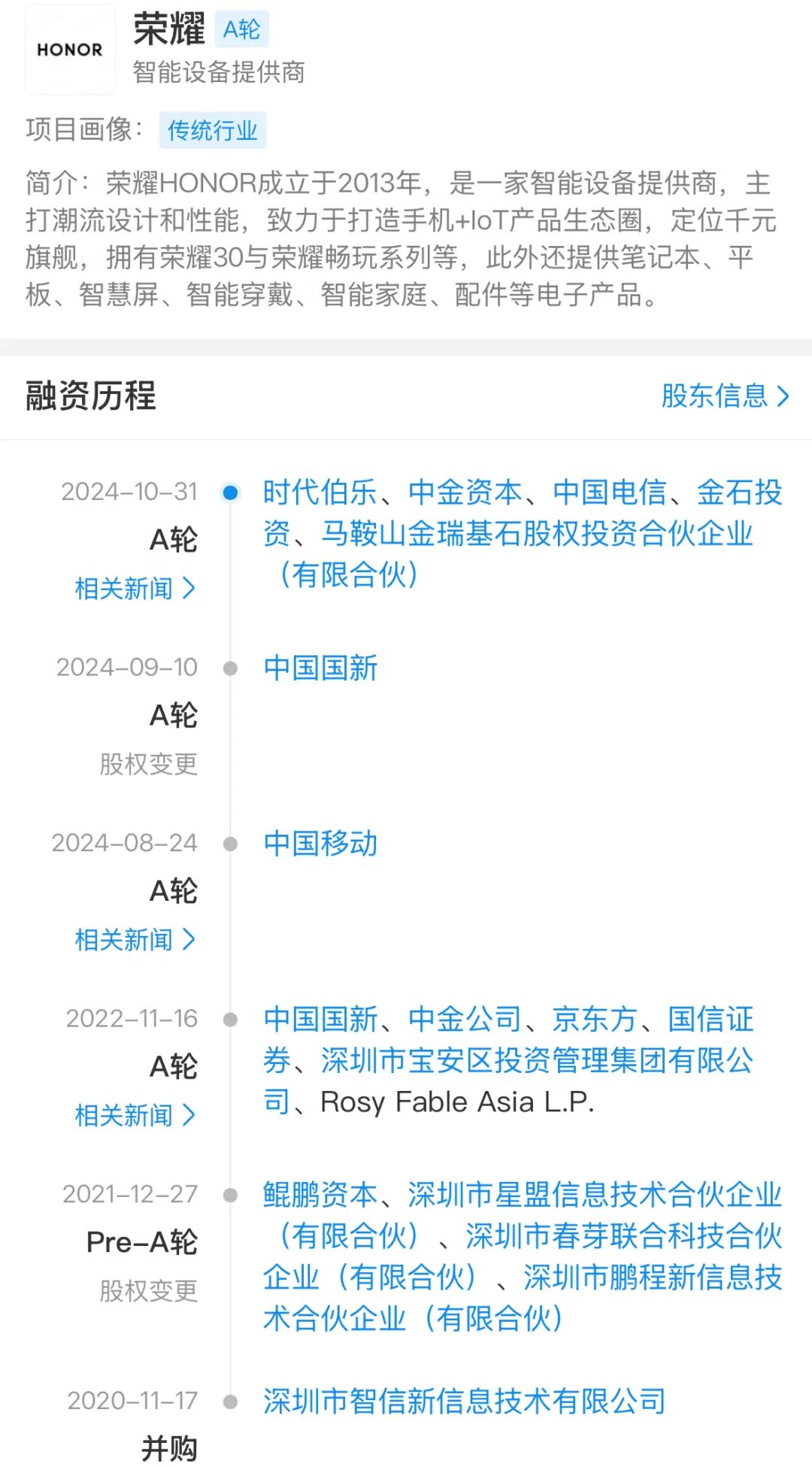 2023年末,榮耀宣佈將通過首發上市的方式進入資本市場。次年,據企查查顯示,榮耀先後在8月、9月、10月完成了三次融資。