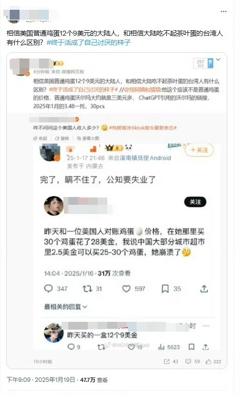 還有“中奸殤”把這種話術發到了X上,結果卻慘遭打臉,很多在美國生活的用中文的網友表示,9美元一打的雞蛋那也確實蠻多的。當然了,“中奸殤”散德行也不是一兩天了,這羣臭不可聞的小丑並不是重點。重點在於為什麼美國雞蛋這麼貴?