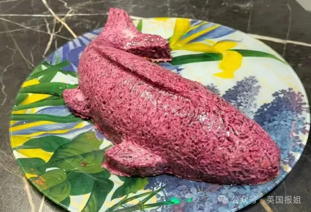 這道紅菜沙拉魚,做得像模像樣還寓意美好。而那盤土豆沙拉蛇,則多少沾點抽象。