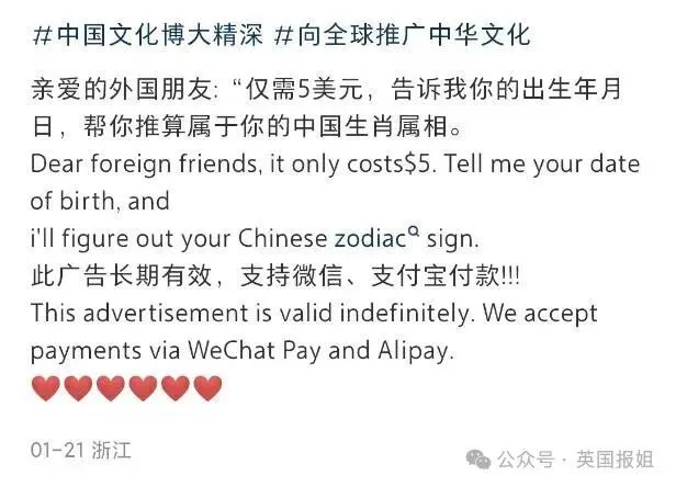有中國網友看出其中的商機,高調在網絡擺攤,5刀勒幫你推算中國屬相、5刀勒買不了吃虧,買不了上當。看了看IP,果然還得是浙江網友,這錢就該讓你掙。