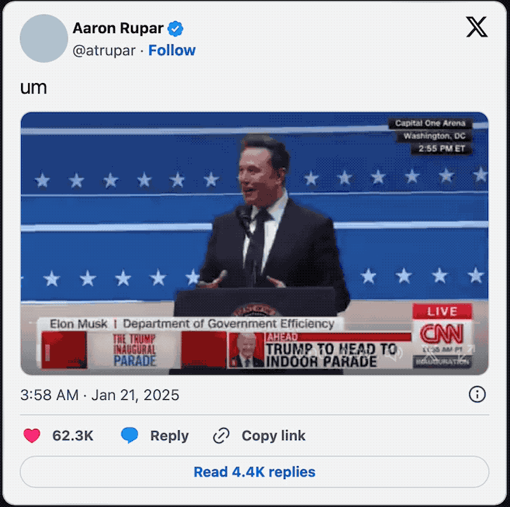 起因是1月20日他在國會山一號體育館集會上,疑似行了“納粹禮”。