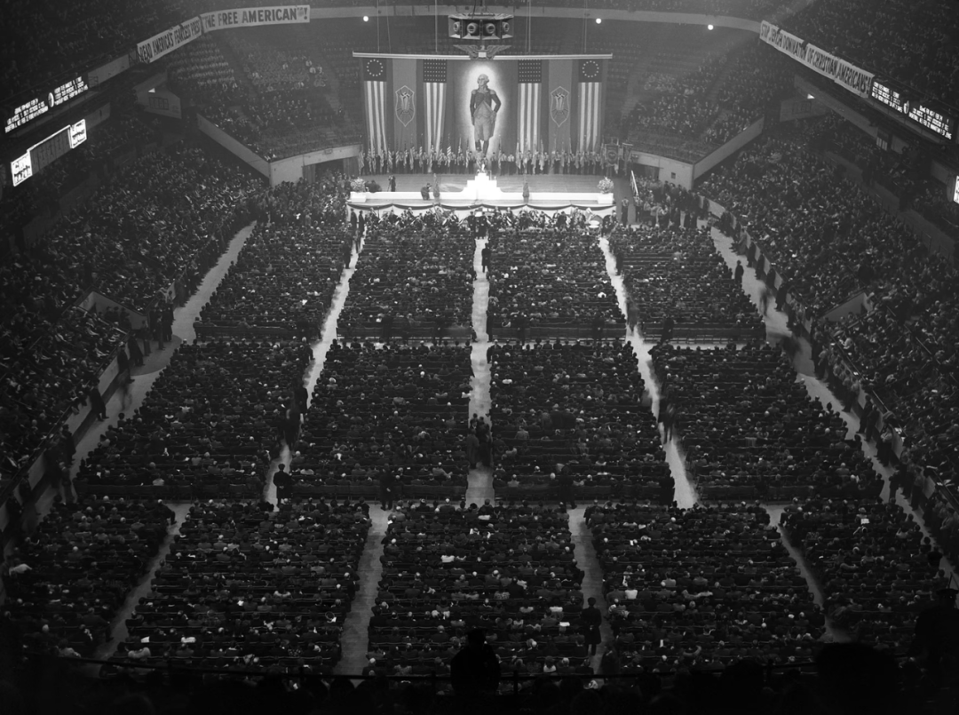A crowd of approximately 20,000 attends a German American Bund Rally at New York’s Madison Square Garden on February 20, 1939. At center is a large portrait of George Washington, claimed as an icon by the Bund, who called him “the first Fascist”, claiming Washington “knew democracy could not work.”