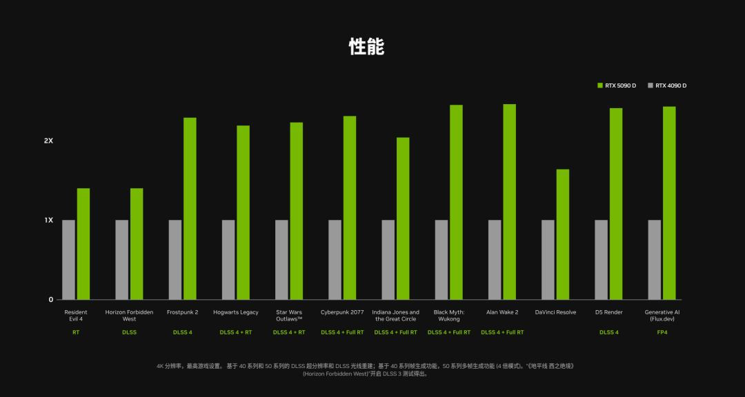 不過,對於已經適配了 DLSS 4 的遊戲來説, 5090D 的提升強得有點可怕。