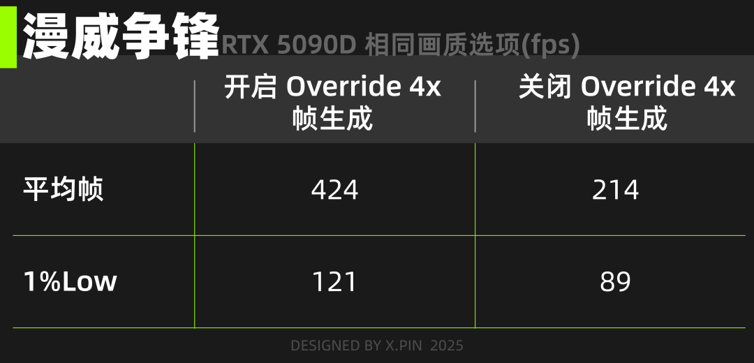 在同樣的畫質下, 5090D 開啓 Override 4x 幀生成功能後,平均幀是 424 幀,要比不開這個功能的幀數( 214 幀 )高出 98% 。同時, 1% Low 幀也高出個 36% ( 從 89 幀提升到 121 幀 )。
