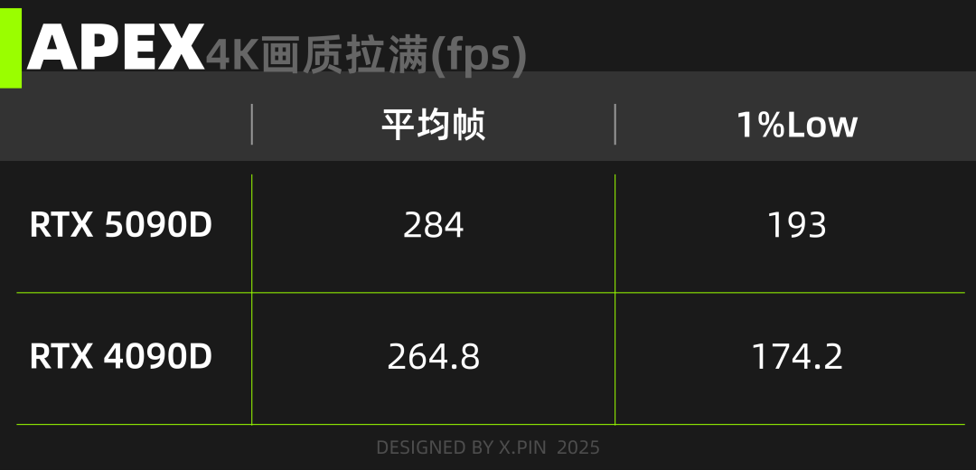 APEX 在 4K 畫質拉滿的情況下, 5090D 平均幀可以跑到誇張的 284 幀,並且 1% Low 幀也有 193 幀。