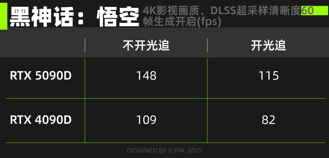 需要説明的一點是,我們測試的時候黑猴還沒有適配最新的 DLSS 4 ,所以正好測試下 5090D 針對 DLSS 3.5 環境的提升,而測出來的 4 組數據也挺讓人意外的——壓根沒有之前 PPT 裏説的翻倍提升,並且在畫質拉滿、開光追的情況下, 5090D 也跑不滿 60 幀。