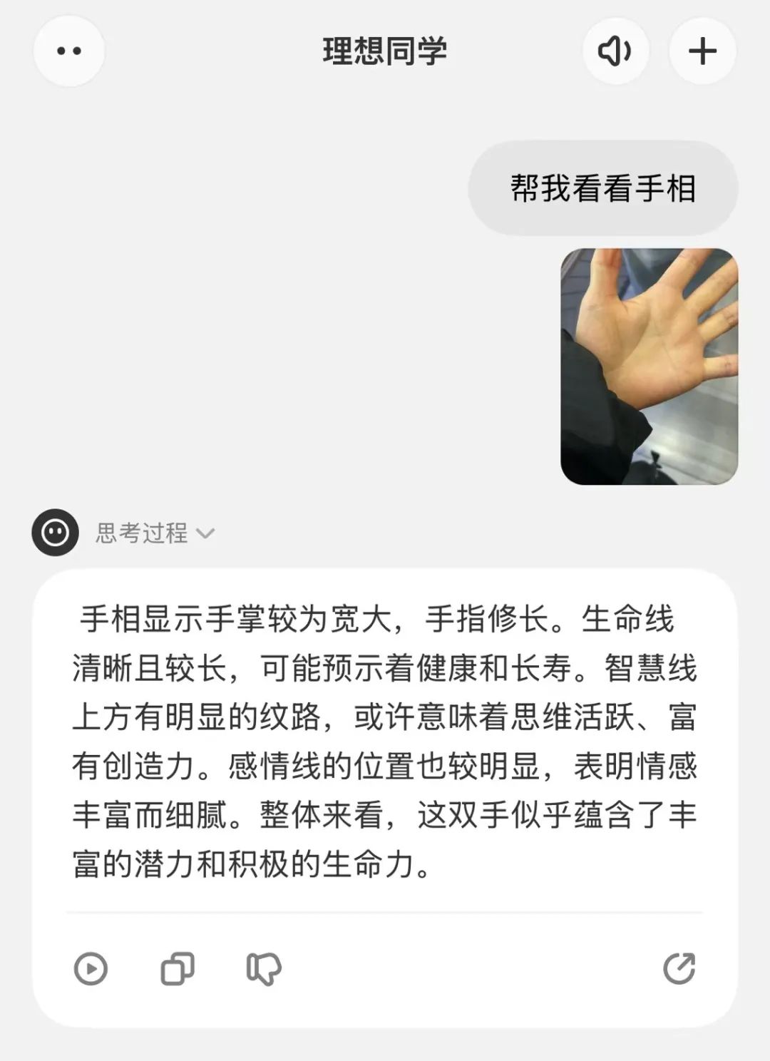 在使用過程中,我還意外解鎖了一些非常有趣的玩法——理想同學可以幫你計算一頓飯的卡路里,也可以幫你看手相、星座運勢,既有內涵又有幽默感,這不就是我理想的AI助手嗎?