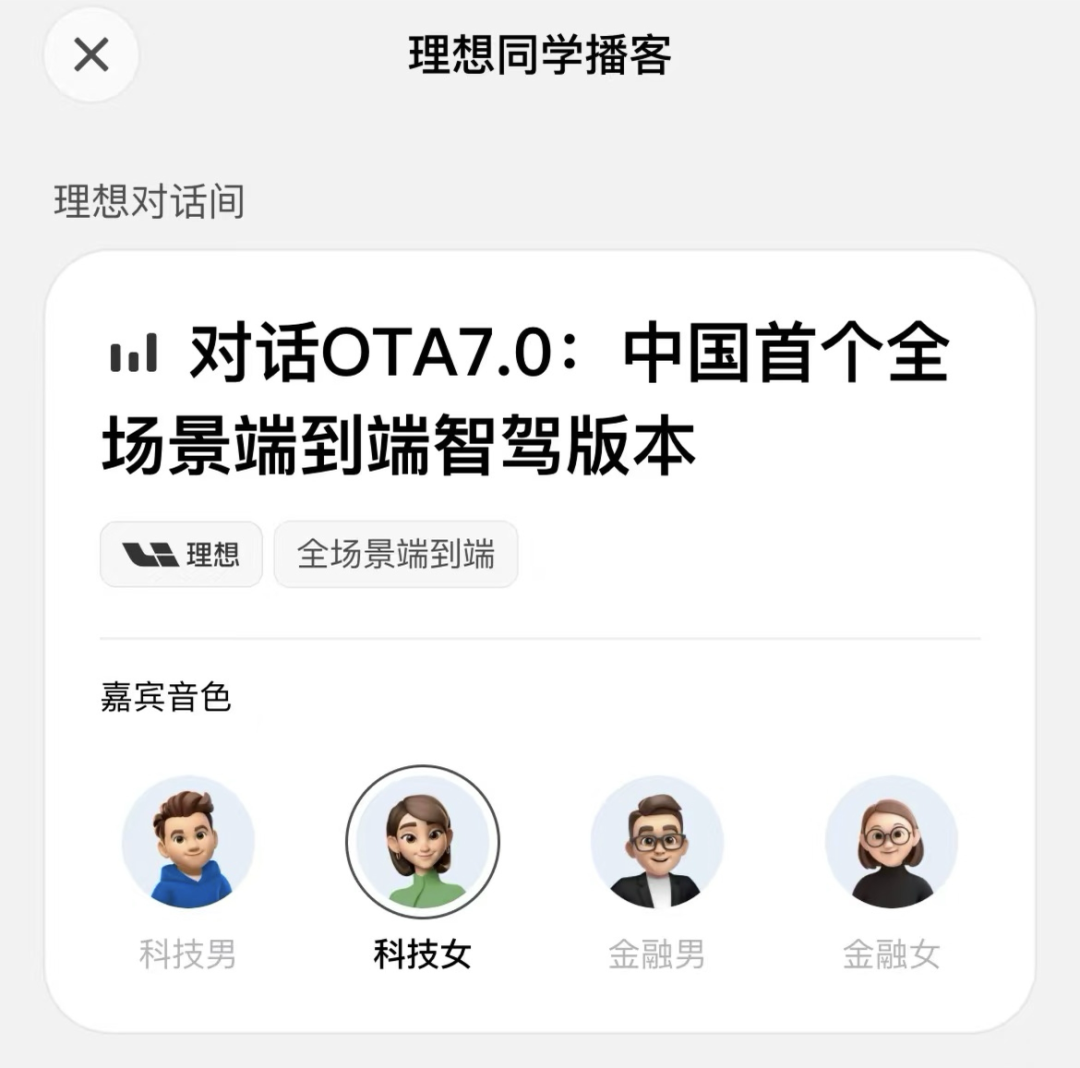 針對一些更專業、更深度的內容,光聽AI語音很容易“走神”,理想同學還推出了行業首創的**「播客」**形式,與虎嗅、量子位等平台合作,將長篇優質內容轉化為輕鬆有趣的兩人對話,還支持主播音色選擇。