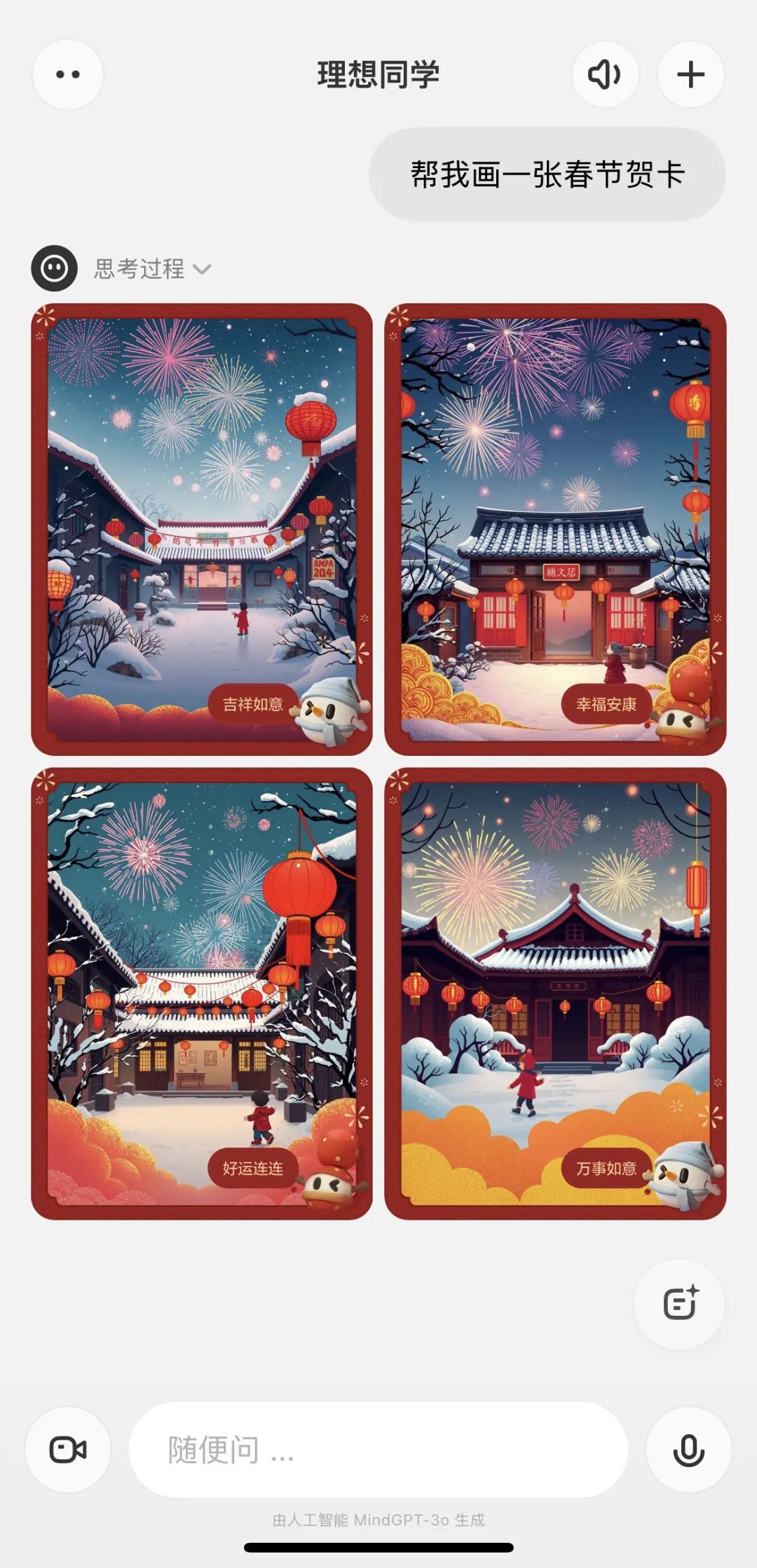 你也可以喊理想同學幫你創作一組祝福文案,畫一幅畫,比如生成一張春節賀卡。