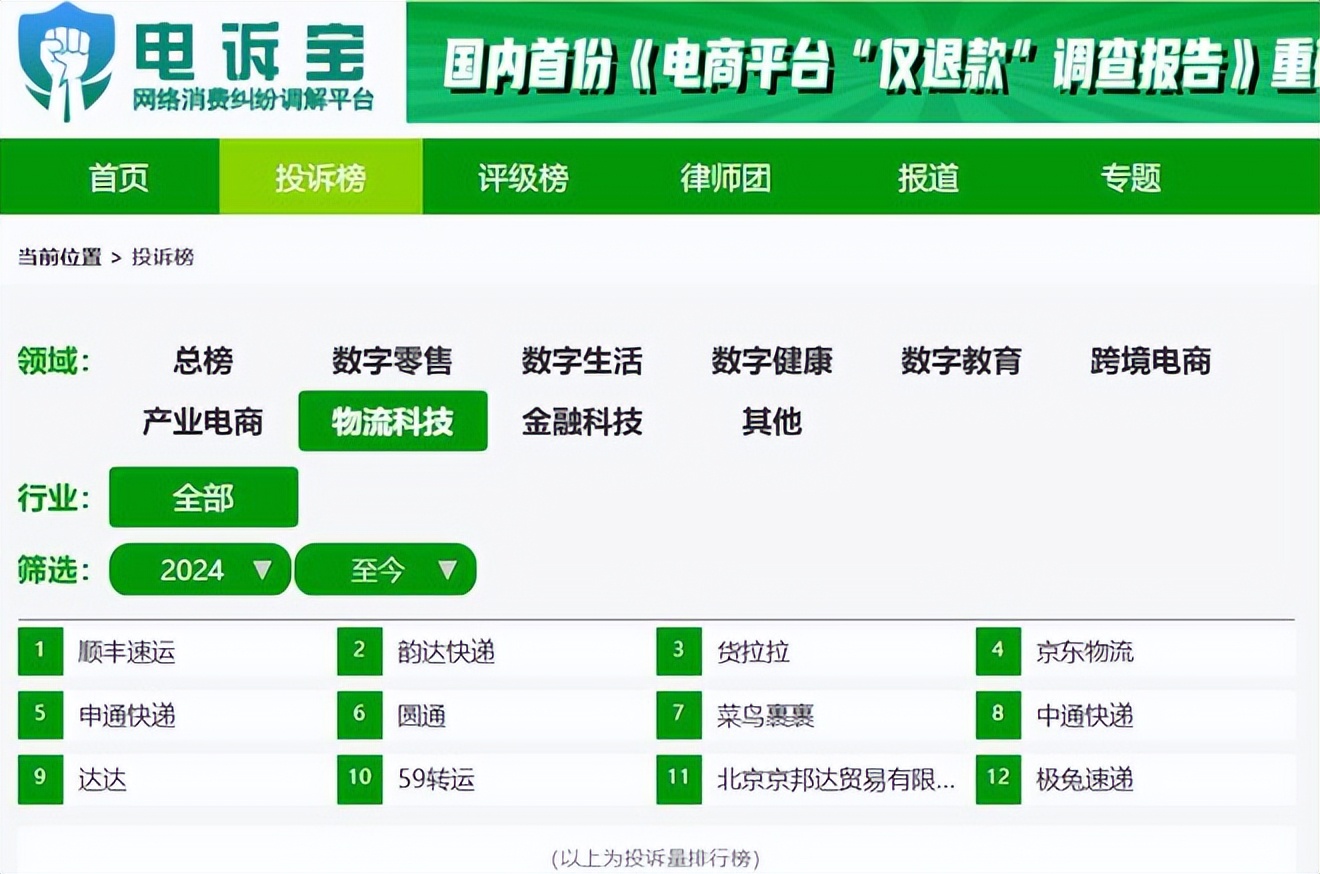 根據“電訴寶”2024年至今受理的中國物流科技領域用户有效投訴顯示,入選投訴榜的依次為:順豐速運、韻達快遞、貨拉拉、京東物流、申通快遞、圓通、菜鳥裹裹、中通快遞、達達、59轉運、京邦達、極兔速遞。此前,郵政、羊貝比、斑馬物聯網、快鳥轉運等也遭遇過類似投訴。