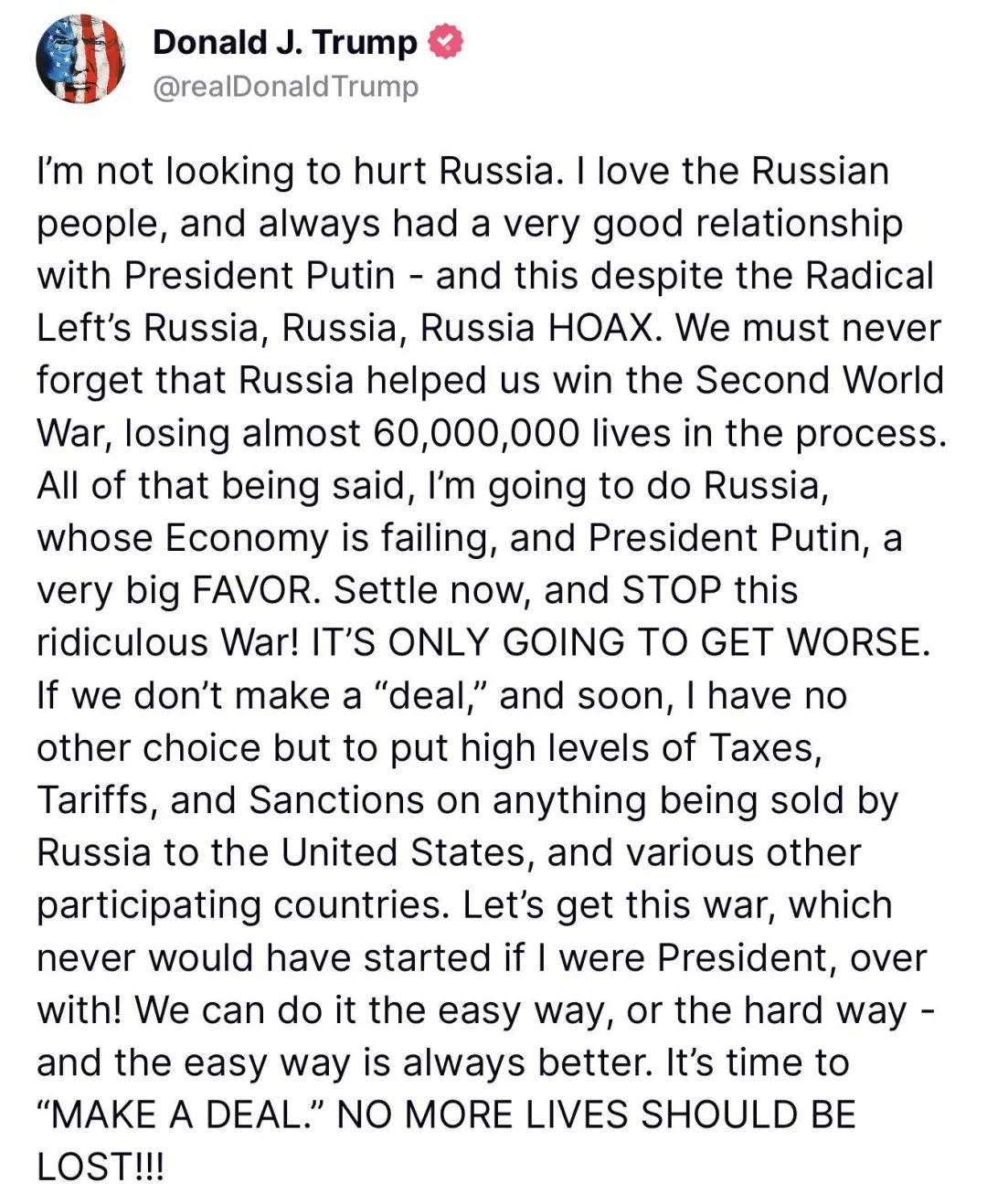 現在對俄羅斯也這樣,先是猛誇一頓,什麼偉大的俄羅斯人民,幫助我們打贏二戰之類的話各種吹捧,吹捧完後就是威脅:如果我們不能儘快達成一份協議,我別無選擇,只能對俄羅斯向美國及其他參與國家銷售的任何商品徵收高額的税收、關税和制裁。