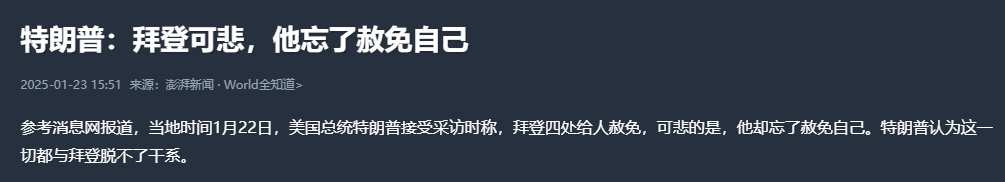接着特朗普冷笑道:拜登赦免了很多人,可惜他忘了最重要的事情,那就是赦免他自己!這可真是個悲劇……..