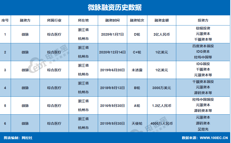 1月7日,微脈宣佈已完成2億元人民幣D輪融資。本輪新增投資方為信銀投資、求是資本、浙江餘杭轉型升級產業基金、德清縣產業發展投資基金、嘉興市南湖股權投資基金,老股東源碼資本、千驥資本、元璟資本繼續追投。微脈本輪融資估值達到65億人民幣。據悉,本輪融資將主要用於微脈在各病種管理方案及AI領域的研發。