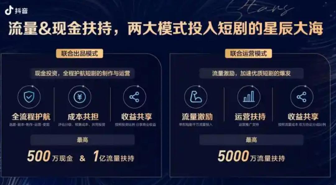 抖音於2024年1月推出“辰星計劃”,面向影視公司、MCN機構、個人創作者等更廣泛的行業夥伴,發佈聯合出品、聯合運營兩大合作模式,推出最高500萬現金和1億流量扶持的方案。2024年11月,抖音發佈影視精品短劇合作政策,在此前“辰星計劃”的基礎上,對投資出品和聯合運營兩大模式進行了升級,並推出保底收益等多項經營扶持舉措。