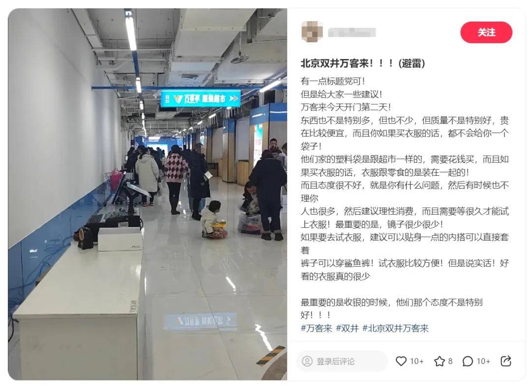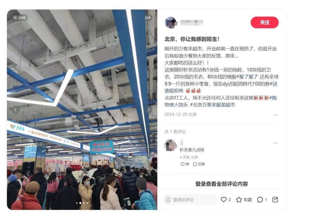 萬客來的三家店在北京開業時,都曾引發過不小的轟動,一個小紅書網友記錄了一些開業時的碎片場景:人多到購物車根本不夠推,人山人海都一筐一筐的買,收銀台排大隊,試衣間排不上……可見在這場給萬客來貢獻GMV的活動中,年輕人也沒少參與。