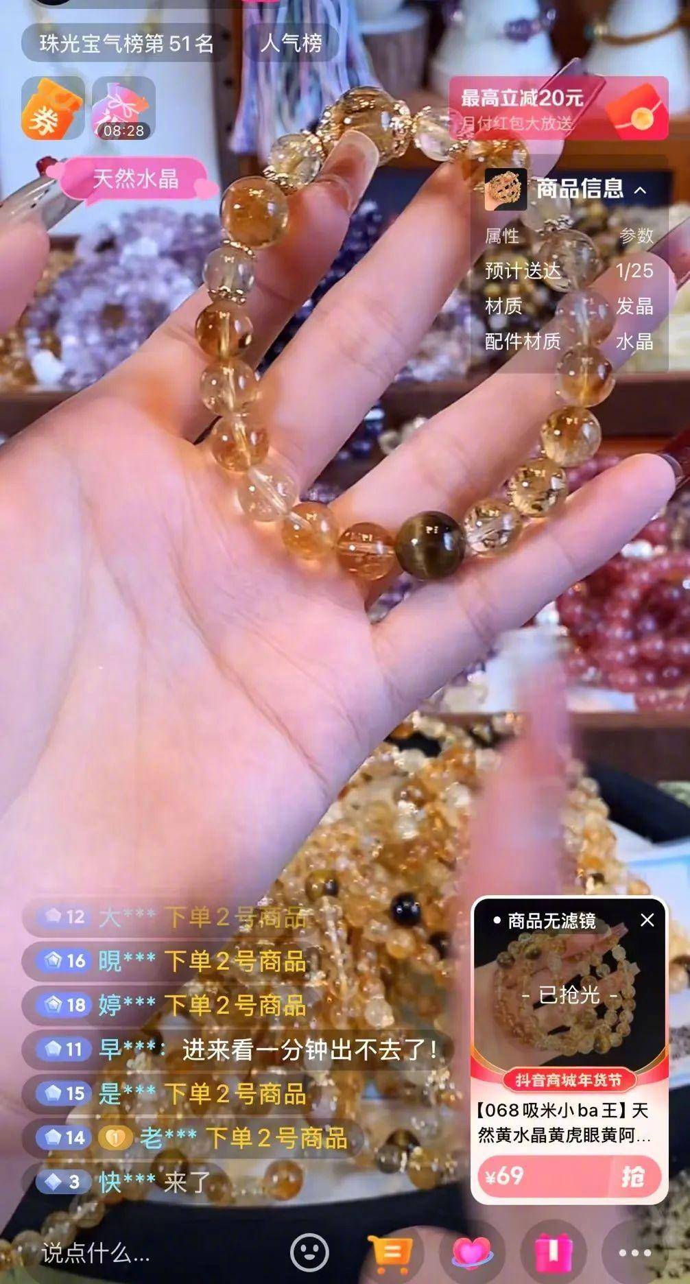 時間剛過22號上午10點,主播準時在直播間開始介紹一款售價69元的黃水晶手串,在“助財運、助事業”等關鍵詞的吸引下,短短幾秒鐘時間,直播間幾百位用户快速下單,該手串被一搶而空。