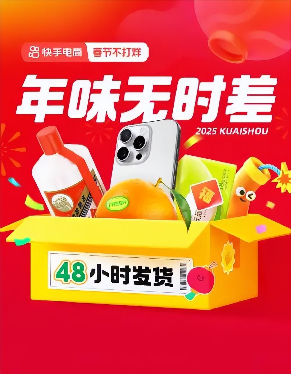 快手電商以“年味無時差 48小時極速發”為主題,打造“春節不打烊”電商會場,在策劃重磅帶貨直播、“下單返黃金”創新玩法的同時,為用户提供48小時發貨的物流保障,提升春節期間的購物體驗,做到“可看、可買、可收貨”。