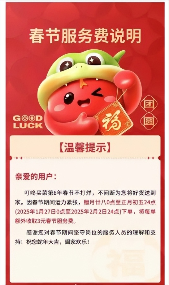 叮咚買菜表示,因春節期間運力緊張,臘月28日0點至正月初五24點(2025年1月27日0點至2025年2月2日24點)下單將收取3元春節服務費。